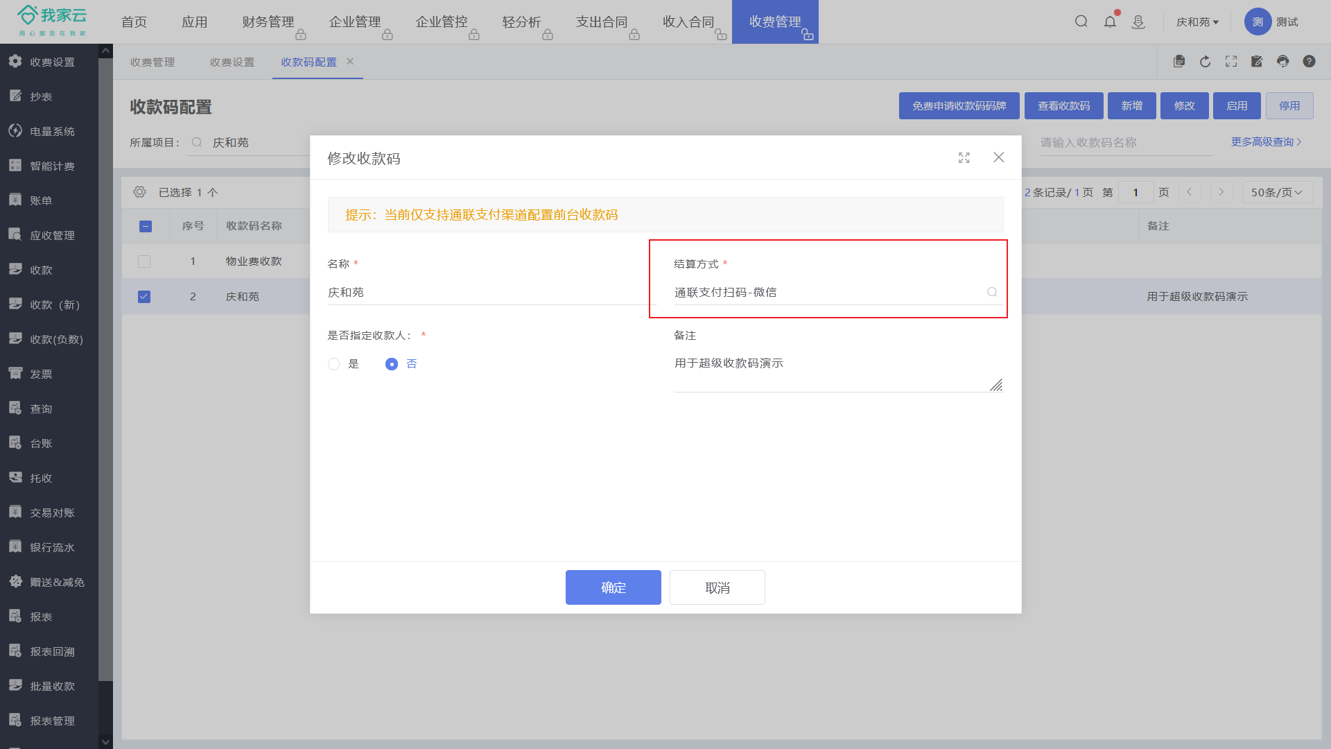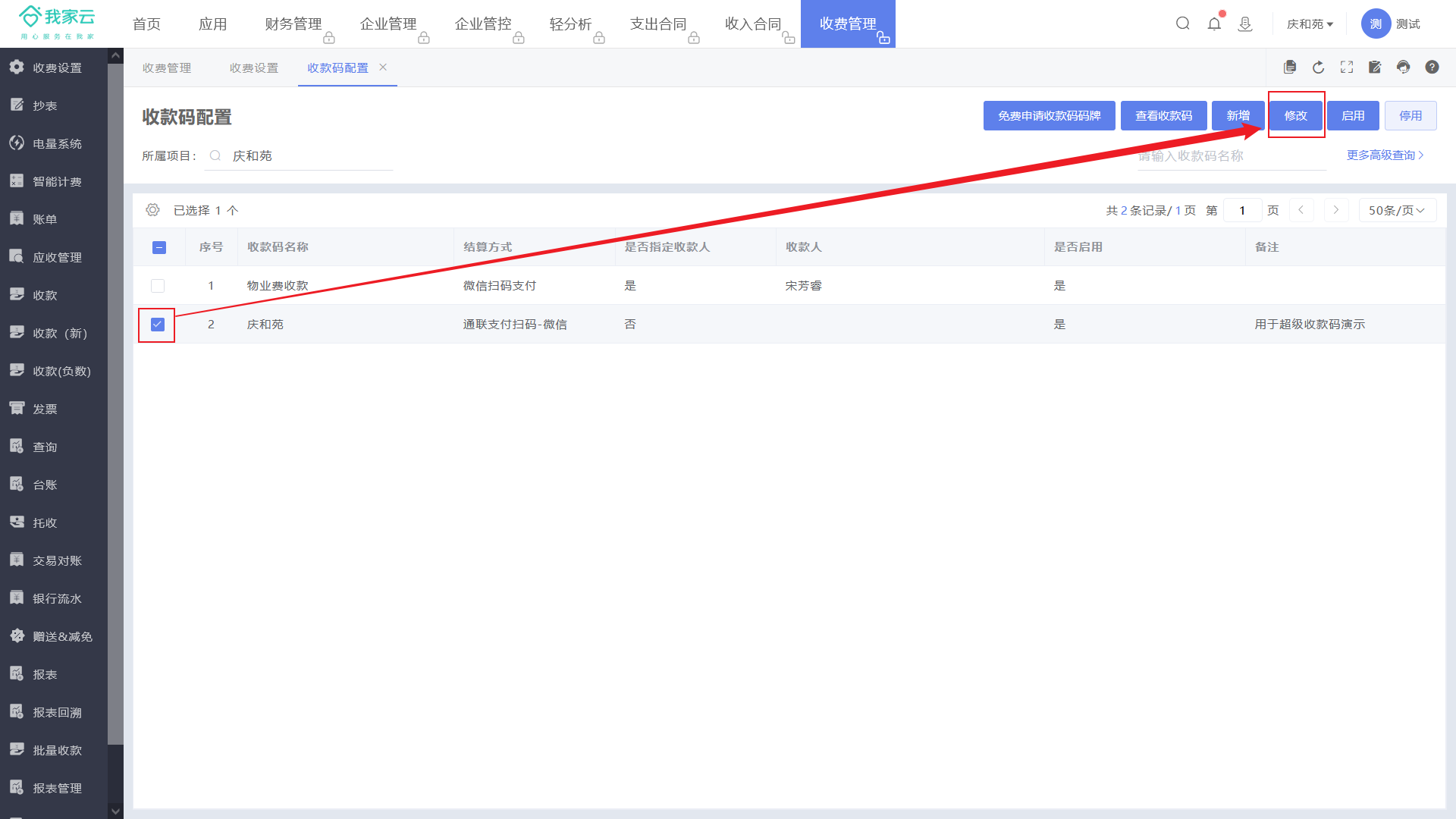 2、收到码牌后,通过【收费设置-收款码配置】选中收款码,点击【修改】关联缴费云收款的结算方式即可使用!