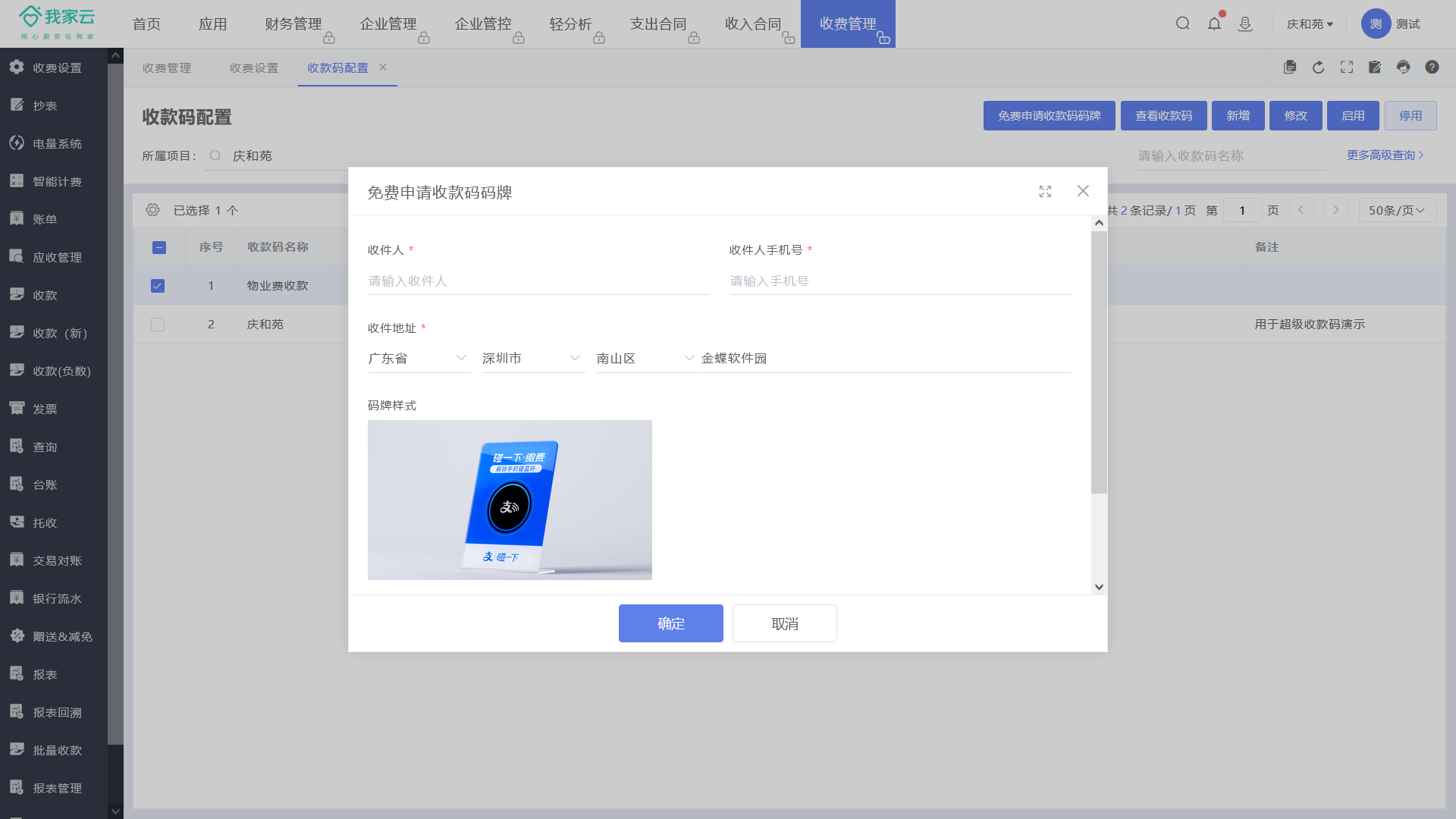 1、通过【收费设置-收款码配置】选中收款码,点击【免费申请收款码码牌】发起申请,填写快递收件信息即可!